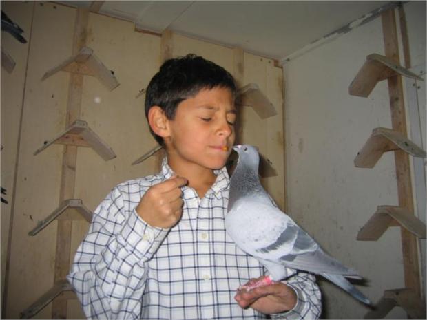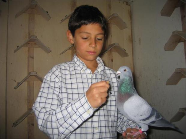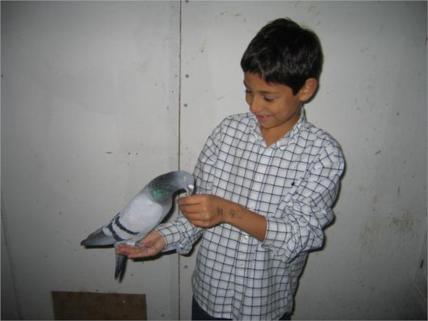 Meu Filho Sérgio dando de comer ao Sergio, neto do Zeus, pombo Base