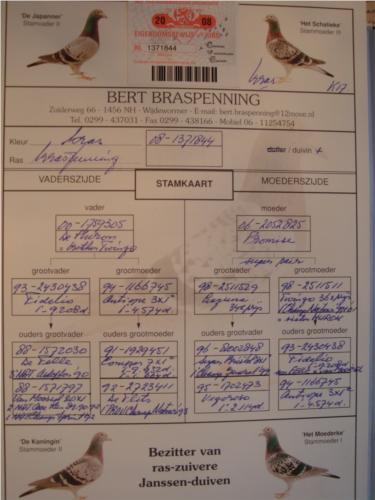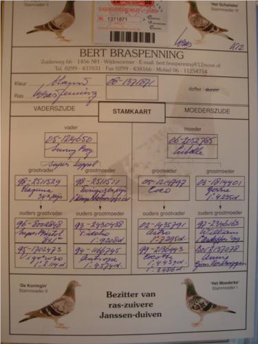 Pai: NL07-3762719 - Filho da Goldstar ( 1º Provincial R1B2000 Creil, 1º St. Quentin, 2º Quieverain, 3º Quievrain). Goldstar é filha Golrush NL04- 0442468 Pombo As Provincial Brabant 2000 ( Distrito Ludo Claessens) e 3 º Melhor Pombo Nacional Meio Fundo 2005 & 2006 ( 1º Sens, 1º Creil, 1º Etapes)