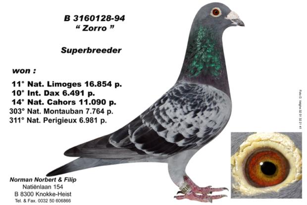Durante as Olimpiadas de 2007, organizei uma visita a colonia do Sr. Filip Norman. Eramos 9 pessoas. Todos compramos pombos do pouco que havia para escolher. Eis que veio para Portugal 1 Filha do Zorro, 1 Filha do Crack Tovenaar ( Neto do Zorro) 1 filha do Robinson ( 1º Nacional de Pau ) e mais uns quantos netos dos cracks do pombal. Visto que existem preços para todos os gostos e carteiras. Nessa altura constatei atraves de conversa com o Manager da colonia Sr. Gilbert Van Parijs que a linha do Zorro era sem duvidas a melhor que tinham ultimamente ( sim, nesta casa já passaram pombos que fizeram historia na Belgica, eu tenho isso tudo documentado porque o Sr. Filip Norman teve amabilidade de me oferecer a colecção completa da historia do pombal em varios livros editados por ele, assim como pedigrees de todos eles ) a prova disso é esta meus amigos.