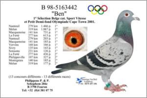 Este borracho é irmão: - Ben 9 x 1º - Bourges 1º Provincial e 2º National Bourges - La Châtre 1º Provincial la Châtre - Irmão do melhor pombo provincial Indep. Liége 01 & 04 Neto do Tramontane - Pombo Olimpico Fundo Blackpool 1999