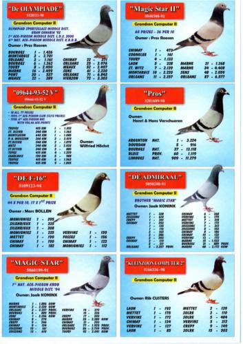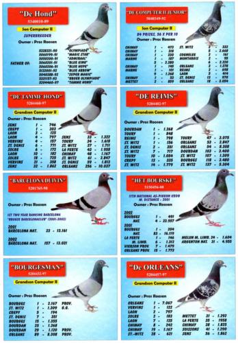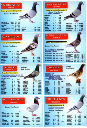 13 1st prizes - 56 x per ten - 80 x prize 1st Ace Pigeon Provincial Short-distance KBDB 1989 2nd Ace Pigeon Provincial Short-distance KBDB 1988 5th Ace Pigeon National Short-distance KBDB 1989 5th Ace Pigeon National Short-distance KBDB 1989 6th Ace Pigeon Provincial KBDB 1990 Grandfather; ' Olympiade' Gran Canaria 1993 Roosen Pros 1st Ace Pigeon Middle-distance 1994 KBDB Koninx Jaak |