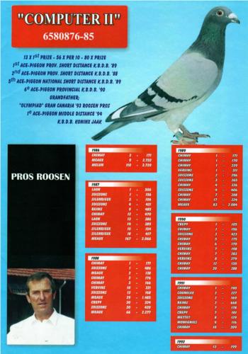 Jos Soontjes tinha o pombal mais rapido da Belgica. Possui-a um casal unico " Late Tom " 6796080-80 x " Geschelpt Verherstraeten " 6688022-81. Este casal reproduzia 1º atras de 1º. Uma verdadeira mina de ouro. Pros Roosen descobriu esta minha de ouro e sem que ninguem presta-se atenção adquiriu em pouco tempo 15 filhos deste maravilhoso casal, para além de uma serie de borrachos dos voadores e reprodutores consanguinios do Soontjes. Na sua casa estes pombos não foram poupados e tiveram de provar o que valiam, atraves de uma selecção muito rigorosa caracteristica do Pros. Dois pombos tornaram-se mundialmente famosos pela sua velocidade Computer I e Computer II e ambos tem o mesmo pai " Tom " filho do celebre casal anteriormente descrito.