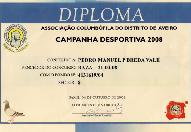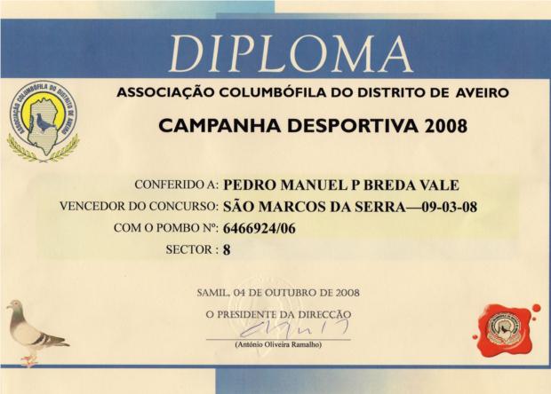 DIPLOMA REFERENTE AO 1º LUGAR NO CONCURSO DE S. MARCOS DA SERRA - SECTOR 8 - 5757p.TAMBÉM 1º NA ZONA 3 - 13024 p.
