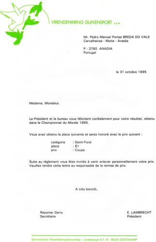 CAMPEONATO DO MUNDO 1995 (VERSELAGA) - 81º POSTO, OBTIDO PELO "DIAMANTE AZUL" - MACHO 193386/88