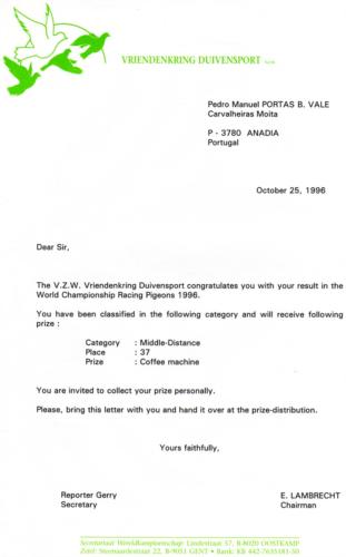 CAMPEONATO DO MUNDO (VERSELAGA) 1996 - 37º NA CATEGORIA DE MEIO FUNDO OBTIDO PELA FÊMEA 4262596/94