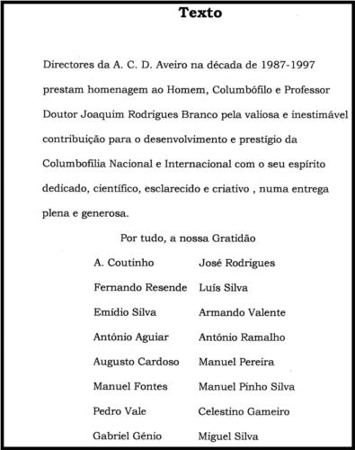 Outubro de 1998 - Lembrança oferecida por 16 dirigentes da A.C.D.Aveiro (década de 1987 - 1997) durante a merecidíssima homenagem ao Sr. Professor Dr. Rodrigues Branco.
