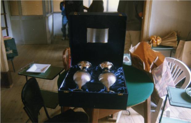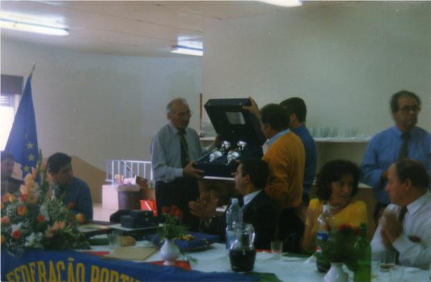 Outubro de 1998 - Momento em que o Sr. Professor Dr. Rodrigues Branco, muito sensibilizado, recebe das mãos do saudoso José Albino Rodrigues e de Luís Silva, a lembrança oferecida pelos dirigentes da A.C.D. Aveiro - década 1987 - 1997.