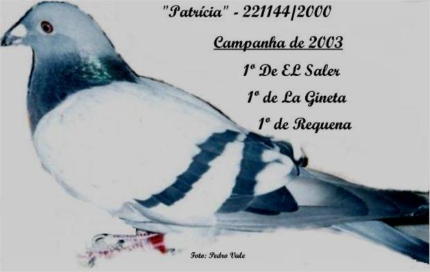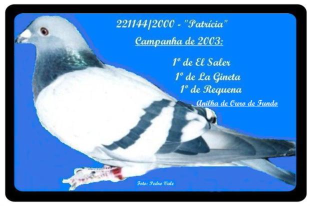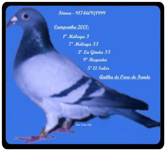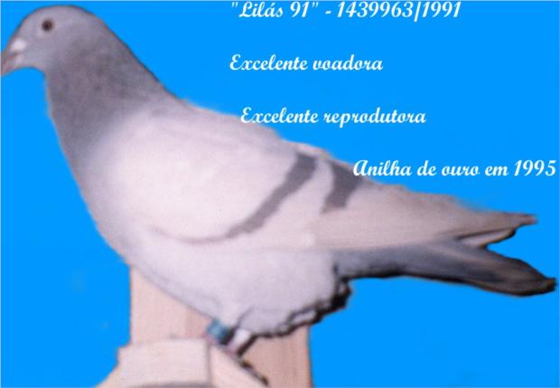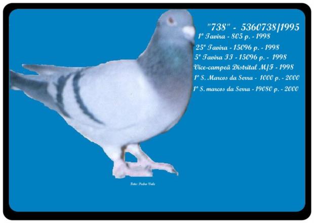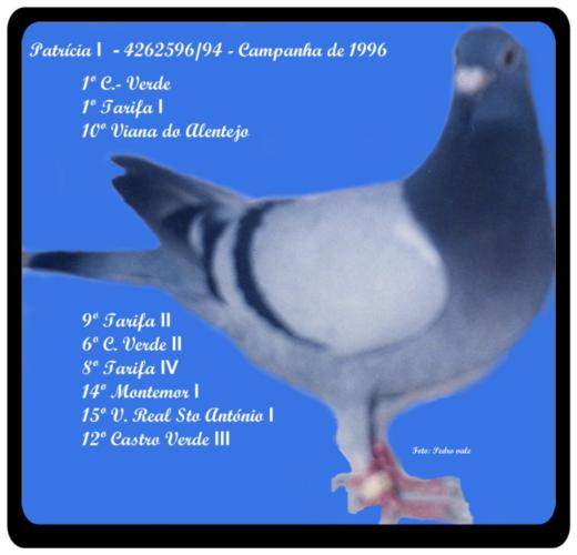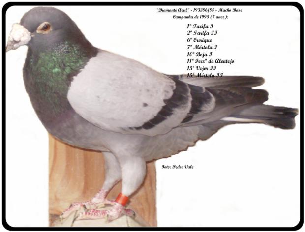 "Diamante Azul" - Voou com 7 anos, na Campanha de 1995, após 2 anos de paragem. Um dos pombos de meu pai,habituado no meu pombal (a aproximadamente 10 Km de distância do pombal de origem),que contribuiu de modo decisivo para eu ter sido Vice-campeão no G. C. Da Bairrada logo no primeiro ano. Faleceu em 2014, Os seus genes estão presentes na maioria dos meus pombos.