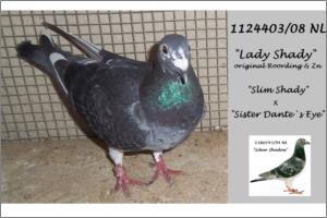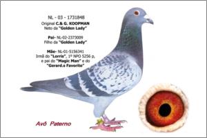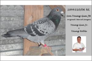 | Pai: 1844310/06 HOL - "Son Young Gun Jr" | Mãe: 1124403/08 HOL - "Lady Shady" | "Son Young Gun Jr" Son Young Gun Jr. Sangers - Janssen ( Sangers x Koopman ). Este macho é neto do "Young Gun" pombo Campeão Nacional de Velocidade da Holanda em 1999 de Marcel Sangers. A sua mãe uma original Koopman filha da "Showpiece" e neta da "Golden Lady".