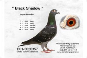 | "Lady Sandra Vrancken" Original Willy & Sandra Vrancken - (Janssen x Grondelears x Soontjes). O seu pai é o "Black Shadow" vencedor de 1º/3º/3º/4º/28º, filho do casal "Blauwe 59" Bi-Campeão de Velocidade e vencedor de 5 x 1º e 2 x 2º x "Het zwart as" Campeã Provincial Velocidade (2.700 pombais)! Mãe - Blauw Paar" filha do Reprodutor Base "De Zot" Campeão Velocidade DP Kermt (106 pombais) x "Goed Bont" Campeã 1999.