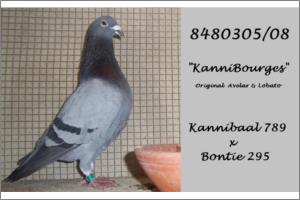 | Pai: 8480305/08 POR - "KanniBourges" | Mãe: 8480303/08 POR - "KaniBlue" | "KanniBourges" Azul - Dirk van Dijk x Marcel Sangers. Por parte de pai é filho do "Young Kannibaal" e da "Seilenna" um neto consanguineo do "Kannibaal" Dirk van Dijk Pombo Campeão Nacional de Meio-Fundo Bélgica e neto do "Phoenix" Campeão Nacional de Meio-Fundo da Holanda, por parte da mãe é neta do "Tommy Gun" (Marcel Sangers) Pombo Campeão Provincial de Velocidade e do famoso "Mister Bond".