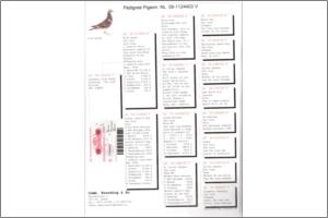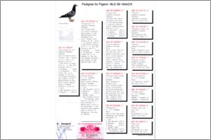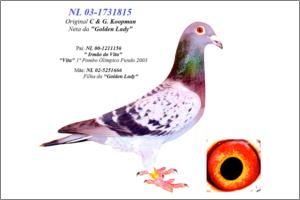 | "Pedrada Koopman x Van Loon" Esta pomba foi tirada para a reprodução, por parte do pai tem origem de pombos Koopman, tais como "CO", "Golden Lady", "Zitter", "Smeulders", "Lei", "Mister Errmerve", "Lorris". Por parte da mãe é Van Loon, filha de uma pomba alemã do Ebert.