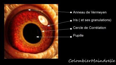 A segunda coisa que notamos olho do pombo é a íris, você pode ver todas as diferentes tonalidades de cor no círculo que fica entre o aluno e a córnea, que representa a superfície superior do olho e continua debaixo das pálpebras. A borda exterior da íris consiste em um círculo preto fino distintas, que, pombo, em homenagem a nossa colega belga, Louis Vermeyen: o círculo de Vermeyen.