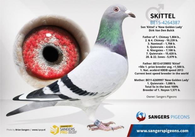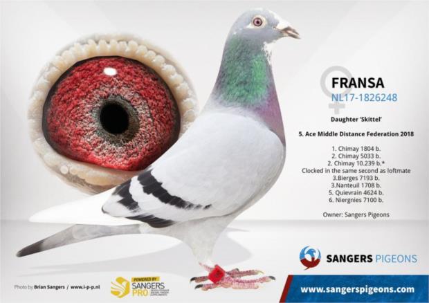 O pai de Fransa é Skittel, um 100% Van Den Bulck e um filho direto do icônico Kittel x New Golden Lady, um par fantástico. Kittel é, naturalmente, um primeiro Nat. Ace Pigeon KBDB, e agora o criador de várias gerações de novos campeões.