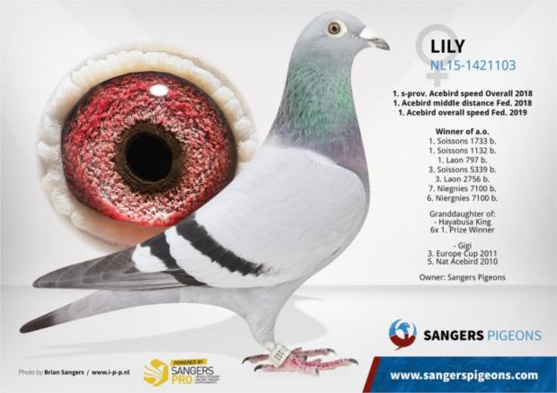 O pai é filho de Hayabusa King, vencedor de até seis primeiros prêmios em grandes corridas, e agora um excelente criador de Marcel Sangers.