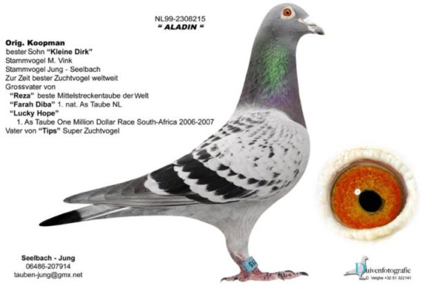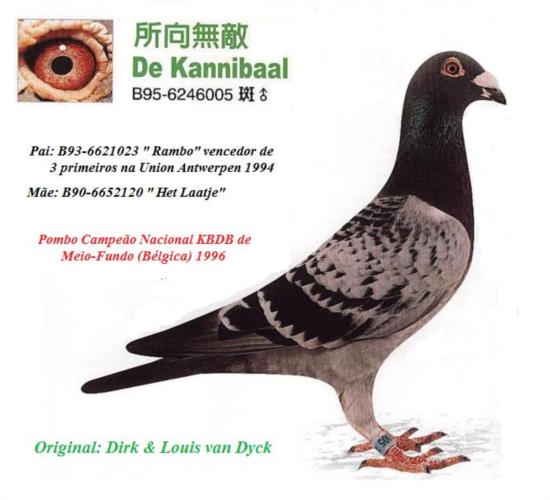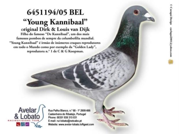 Mas a grande fama não vem só de ter ganho a fama vem de o Kannibaal ser um super reprodutor cujos genes dominantes passam de geração para geração e ter ido parar uma filha a casa do Gerard Koopman adquirida na venda anual da Gala da Golden Duif. Esta filha cruzada com a constelação Koopman sim porque o Koopman já tinha grandes pombos antes da Golden Lady BE 96-6286060(filha do Kannibaal) la chegar estou a falar do De Eric, Gentil, Branco, de Zitter, Raket 84, Van Loon 112, Van Loon 48 etc....Sendo que quando esteve cruzada com o Gentil ( NL92-5310320) produziu o pombo mais famoso do Koopman que é o pequeno Kleine Dirck NL 98-5821416(filho da Golden Lady) um verdadeiro fenomeno a voar e a reproduzir. Hoje os filhos do Kleine Dirck atinguem valores incalculaveis devido a sua capacidade reprodutiva. Convem resalvar que a mãe da Golden Lady era uma irma do Rambo logo estamos perante um cruzamento Sobrinho x Tia ( esta nota é para quem gosta destas coisas). Pombos como o Aladin NL99-2308215 ( Filho do kleine Dirck) como o Tips (filho do Aladin) produziram verdadeiras maquinas ganhadoras na Holanda como é o caso do Reza e da Farah Diba da Marijke Vink, hoje assiste-se no Pipa a venda de filhos e netos destes pombos todos atras mencionados por pequenas fortunas.