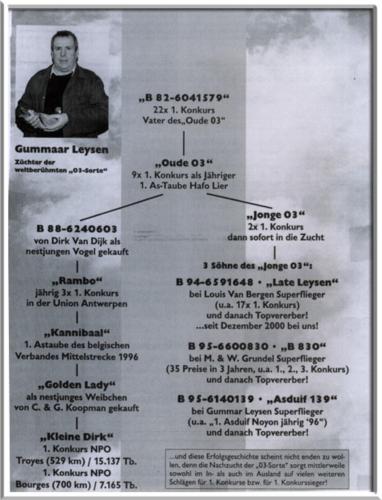 Em 1988 o Dirck Van Dyck comprou um pombo B 88-6240603 cujo pai era um pombo do Gummar Leysen´s (um dos melhores meio-fundistas belgas) com o numero de anilha B 86-6114203 que tinha ganho 11 x 1º premio como borracho e foi pombo As HafoClub Lier (catedral do meio-fundo na altura). Por sua vez este pombo de 88 foi cruzado com uma femea do Marien-Royberghs a B 89-6202092 proveninente de uma excelente linhagem já que a sua mãe era irma do Autogewinner cruzada com o pombo As B 77-6419658.