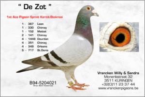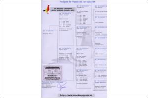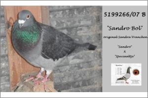 "Sandro Bol" Original Willy & Sandra Vranckenn (Janssens x Soontjes x Grondelaers). Pedrado Negro. Filho de "Sandro" que é originário do cruzamento "Gebroken Graat" filho do "The Zot" super reprodutor X "Sandrine" vencedora do 9º Provincial de Orleans, por parte de mãe e filho da "Speciaaltje" que é originária do cruzamento "De Goeie" vencedor de 2x1º X "Tikkel" filha de "Zwarte Bol" vencedor de 2x1º .
