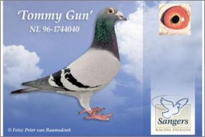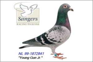 "Son Young Gun Jr" Son Young Gun Jr. Sangers - Janssen ( Sangers x Koopman ). Este macho é neto do "Young Gun" pombo Campeão Nacional de Velocidade da Holanda em 1999 de Marcel Sangers. A sua mãe uma original Koopman filha da "Showpiece" e neta da "Golden Lady".