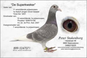 "Turbo Pentium" Peter Veenstra x Marcel Sangers Azul Um irmão (parte de mãe), ganhou no pombal de Marcel sangers em 24-05-2008, 1º Provincial em 2491 pombos e 6º Nacional em 12700 pombos de Abilis (510 Km)