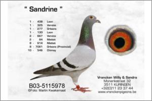 "Lady Sandra Vrancken" Original Willy & Sandra Vrancken - (Janssen x Grondelears x Soontjes). O seu pai é o "Black Shadow" vencedor de 1º/3º/3º/4º/28º, filho do casal "Blauwe 59" Bi-Campeão de Velocidade e vencedor de 5 x 1º e 2 x 2º x "Het zwart as" Campeã Provincial Velocidade (2.700 pombais)! Mãe - Blauw Paar" filha do Reprodutor Base "De Zot" Campeão Velocidade DP Kermt (106 pombais) x "Goed Bont" Campeã 1999.