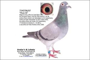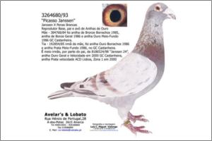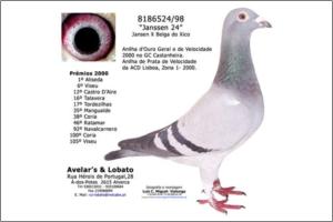 "A 24" Picassos Janssen x Stakenborg. Boa voadora de velocidade, 1º Sabugal 222km, 9º ACDL Bloco 1 em 1946 pombos. Familiar da 1º Distrital ACDL de Sabugal entre 10686 pombos, 2º Distrital ACDL de Canizal entre 12497 pombos, 3º Distrital ACDL Tordezilhas entre 10005 pombos.