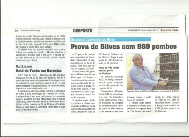 Como exemplo temos a SOCIEDADE COLUMBÓFILA DE BRAGA que tem publicado nos 2 jornais da cidade O CORREIO DO MINHO e o DIÁRIO DO MINHO, uma pequena reportagem semanal sobre cada uma das 6 soltas realizadas até á data, com direito a foto e tudo, na primeira semana o vencedor JOEL VIEIRA, na seguinte BARBOSA & FILHOS, depois os ASAS DE VILAVERDE e por último o VIEIRA MARQUES, todos eles orgulhosos com o seu crack vencedor nas mãos
