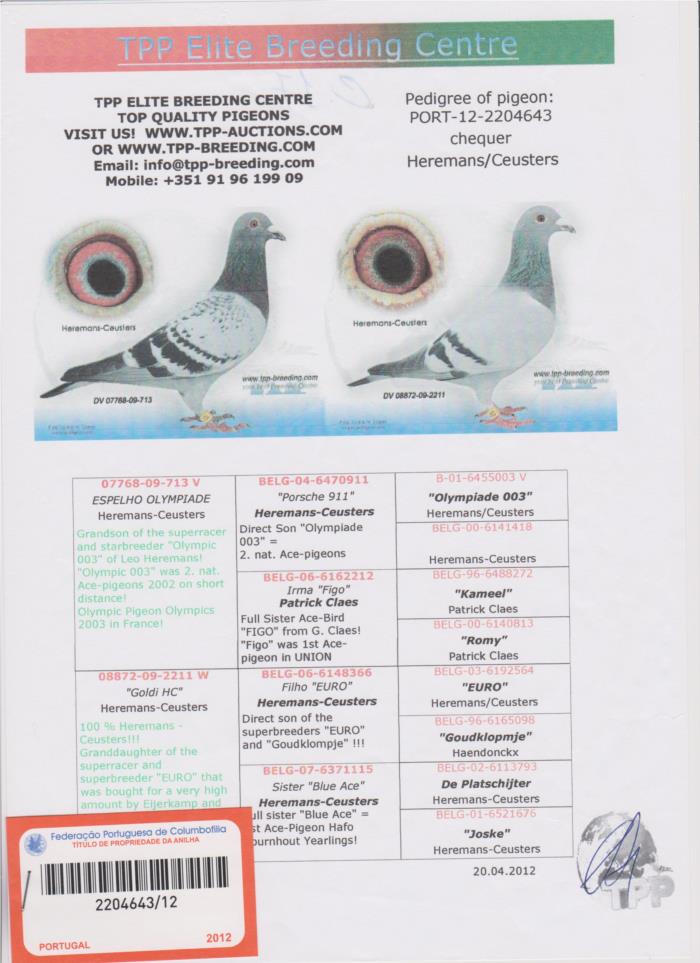 Fêmea original CIC, fruto de um cruzamento de um neto do ESPIRITO INVENCIVEL com uma filha do SALINERO. O filho desta fêmea foi o meu 1ro POMBO ÁS, no entretanto extinto Derby LUZENSE 2011.