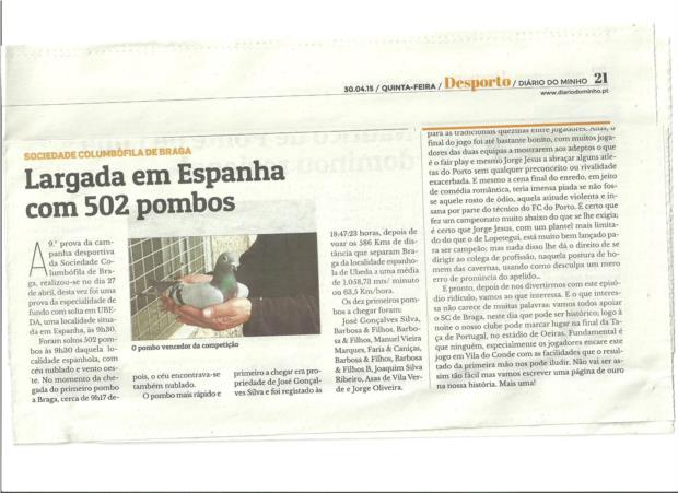 Pois bem a SC BRAGA continua com a campanha de divulgação dos resultados das provas nos jornais da cidade. Desta vez foi o resultado da ultima prova de fundo com solta em UBEDA que enriquece a página desportiva do jornal DIARIO DO MINHO.