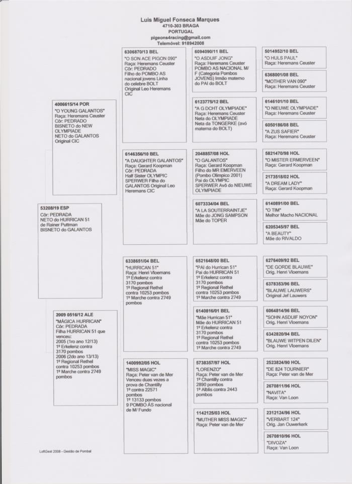 Em cedência uma NETA do Famoso HURRICAN 51 de Rainer Puttman, esta fêmea competiu no DERBY de RIAS BAIXAS e voou mais de 2000 km e venceu o 2do Treino, regressou também da dificil FINAL de FUNDO de 600Km, onde se perderam mais de metade dos pombos em competição!