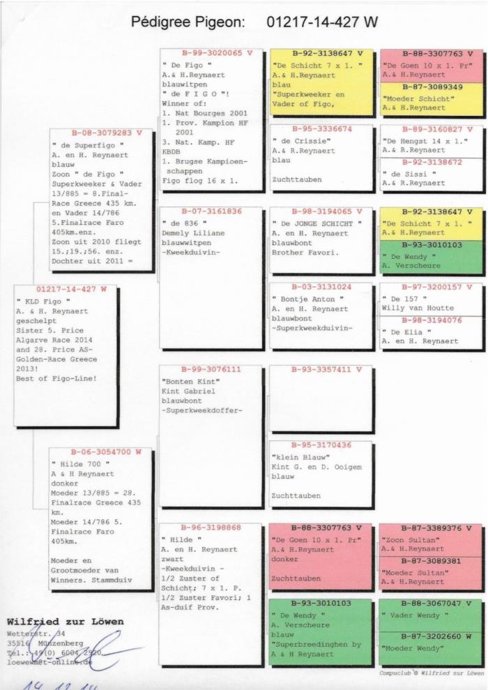 A "GOA" e neta do FIGO de A u H Reynaert e Bisneta e consanguinea do "GOEN", que por sua vez é avô do mundialmente famoso "FIGO"! O "GOEN" foi também ele um fantástico voador e venceu 10 x 1ros Prémios.