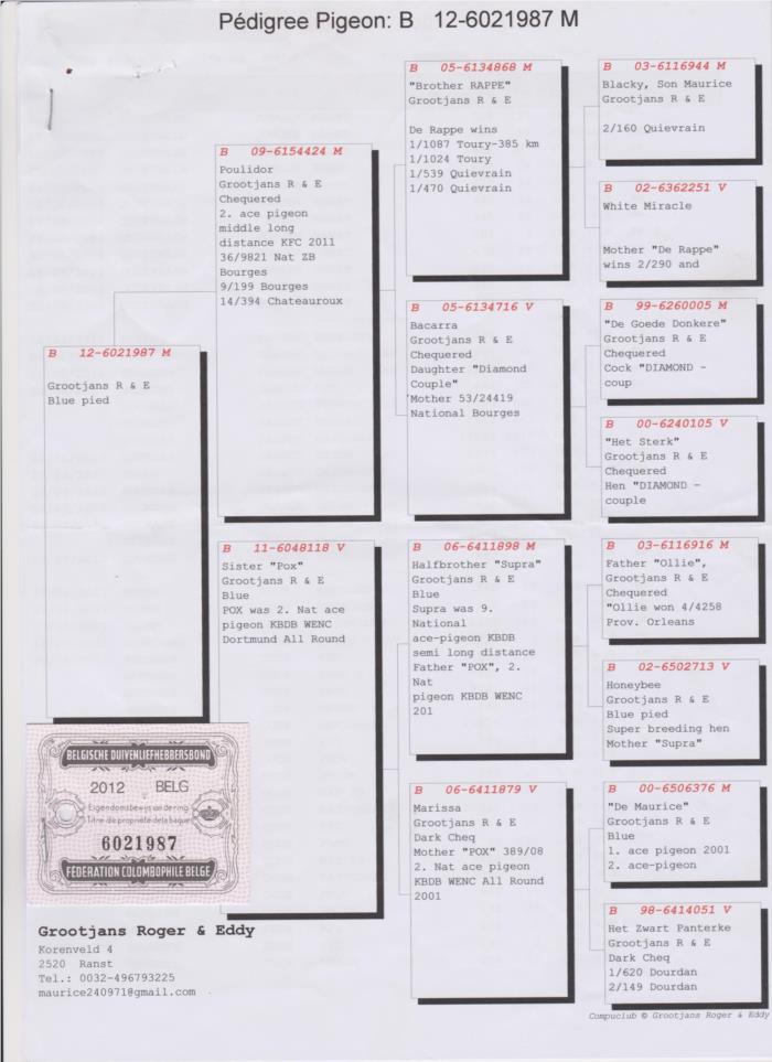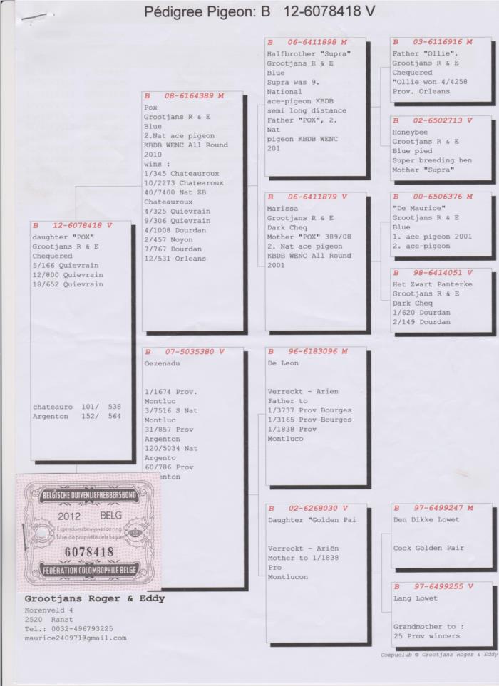 O "POX" é filho do HALFBROTHER SUPRA (9º Pombo ÁS Nacional de M/F) e neto do MAURICE (Pombo ÁS 2001)! Esta linha de pombos ficou muito conhecida na zona norte de Portugal, mais concretamente pelos excelentes resultados da colónia de Sebastião & Martins. A fêmea do CASAL BASE desta colónia, era precisamente uma irmã do "POX" a Azul 443 BE-6056443-10. Os seus descendentes (filhos e netos) ganharam vários 1ros prémios e anilhas ao longo dos ultimos anos!