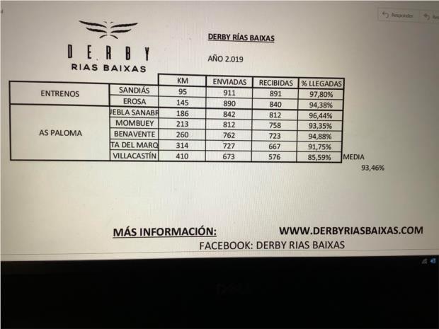 Como podem constatar pela seguinte TABELA a média dos pombos enviados e regressados é sempre SUPERIOR a 85%, incluindo a PROVA FINAL com 410 KM, um DERBY que começou com cerca de 1000 pombos e terminou com quase 600 pombos. E não é apenas no numero de pombos chegados que este DERBY é exemplar, mas sim na consistencia da chegada, onde por exemplo na PROVA final recebeu praticamente 500 pombos nos primeiros 40 minutos após a constatação do 1ro pombo.