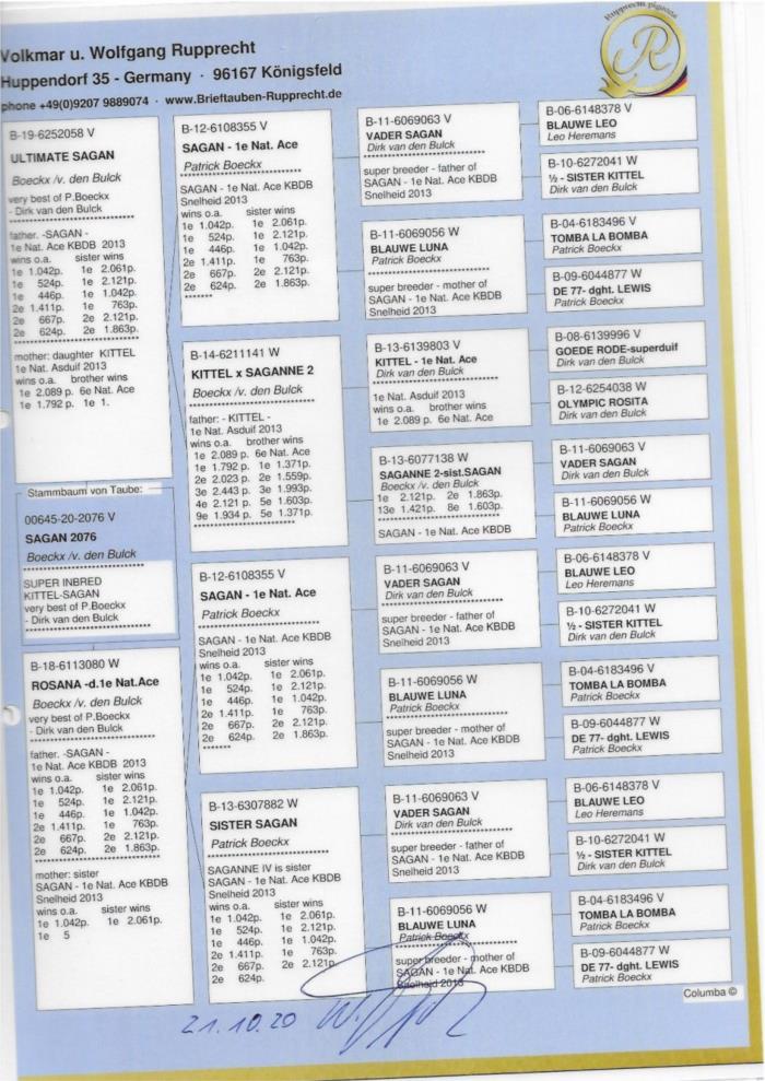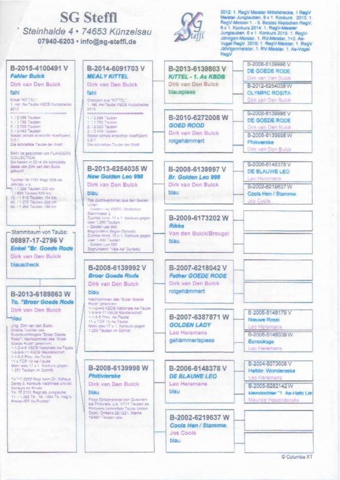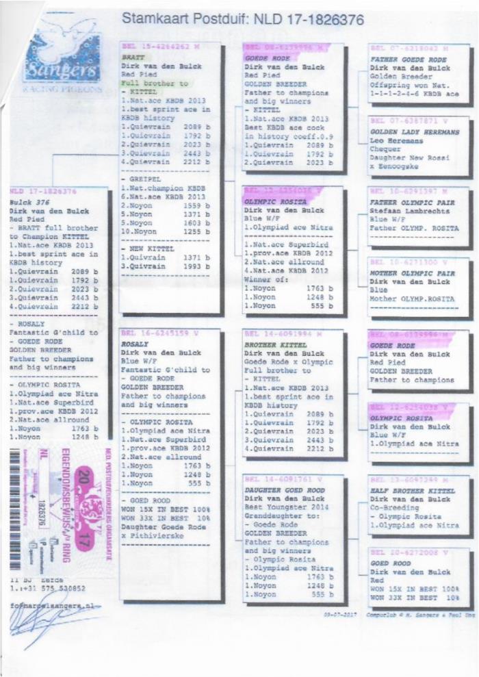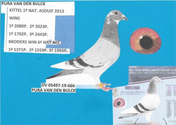 Disponível um MACHO descendente da linha van den bulck, no pedigree pode encontrar entre outros o famoso KITTEL e o SAGAN, ambos pombos ASES nacionais!