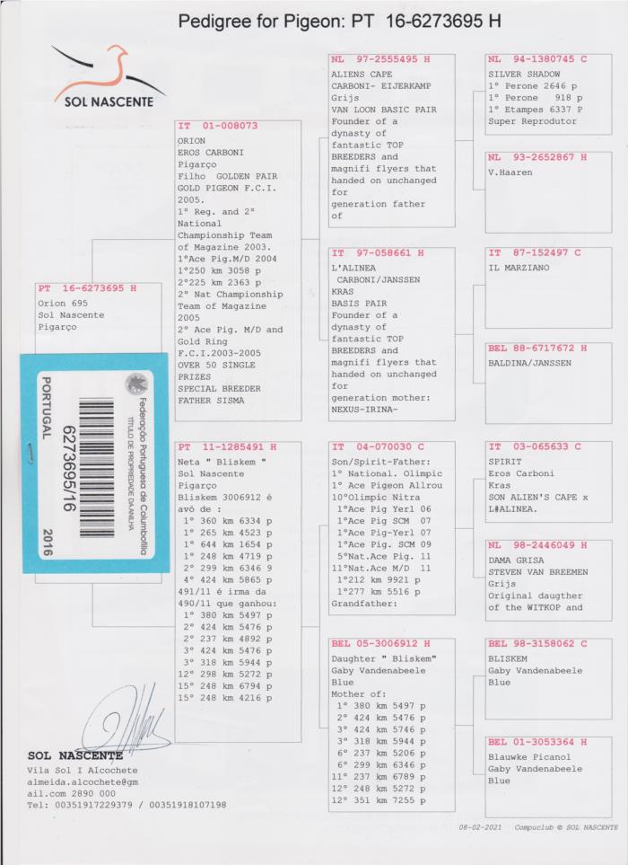 Em cedência 1 exemplar de linhas bem conhecidas da columbófilia Nacional. NETO e consanguineo do ORION (Filho do CASAL BASE de EROS CARBONI)