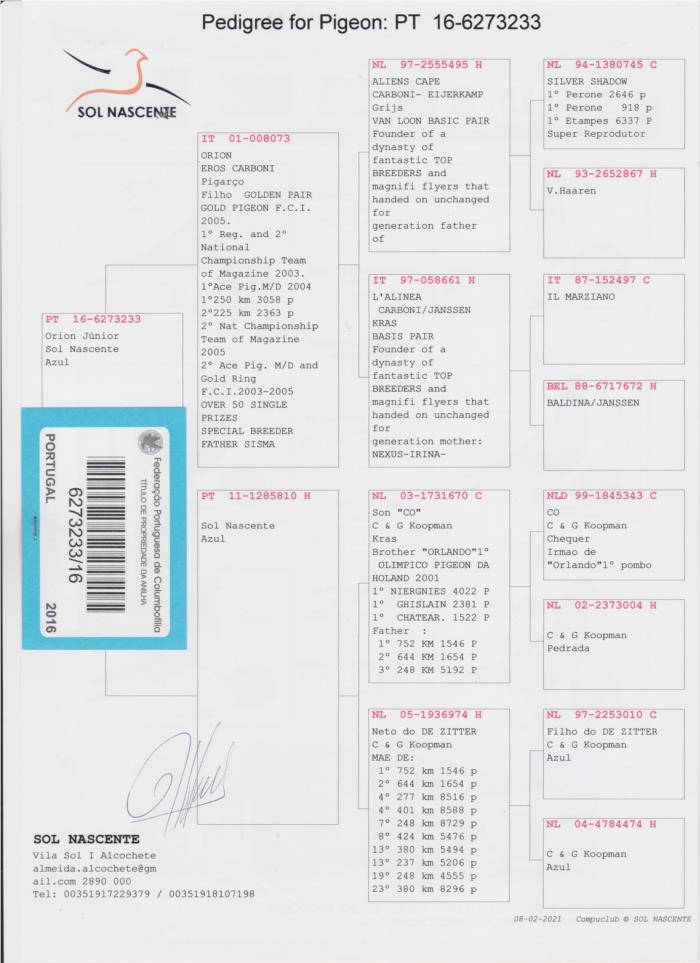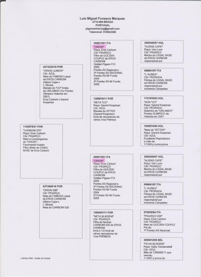 ORION é um FILHO direto do CASAL BASE de ERO CARBONI (Também ele um excelente voador e reprodutor)