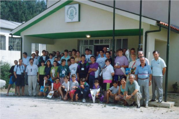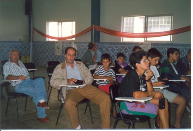 Férias Desportivas da FPC nos anos 90 - Durante um colóquio na Associação Columbofila do Distrito de Aveiro. Da esquerda para a direita: Celestino Figueira de Cantanhede, eu e meu filho João Pedro além dos integrantes do grupo de jovens.