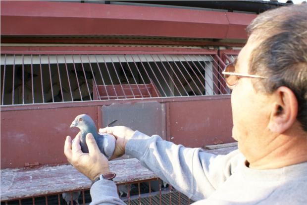 José Carlos Vieira admira um dos seus extraordinários voadores. No caso o Anilha de Ouro 2007 da Sociedade Columbófila Ninense.
