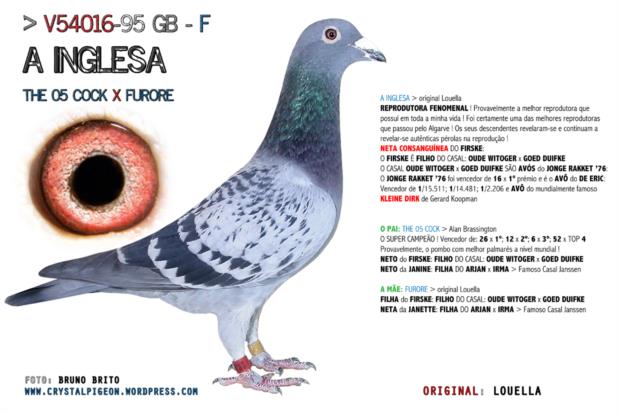> 54016-95 GB - "A Inglesa" Filha do fenomenal, a lenda, o único - "The 05 Cock" > Vencedor de 26 x 1º prémio ! Vencedor de 12 x 2º prémio ! Vencedor de 6 x 3º prémio ! > 52 prémios no TOP 4 ! Provavelmente, o pombo com o melhor palmarés a nível mundial !