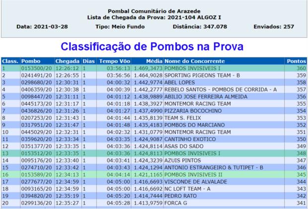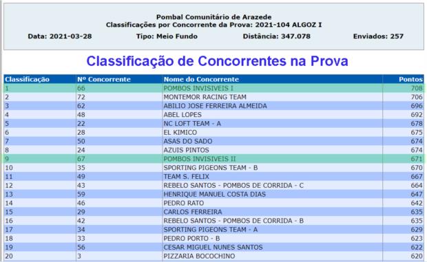 Mais uma prova exigente para borrachos, MF 347Km, mais uma excelente prestação das minhas equipas no pombal comunitário de Arazede. 1º Prémio com mais de 40 segundos sobre o 2º e mais de 4 minutos sobre o 3º. 1ª e 9ª melhores equipas na prova o que permitiu à equipa I subir ao 1º lugar da Geral e 3º de MF, e a equipa II alcançou a liderança de MF e subiu ao 7º da Geral.