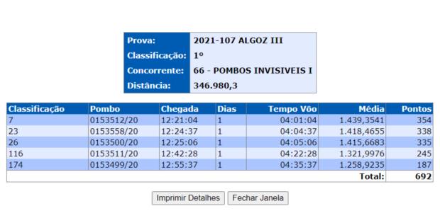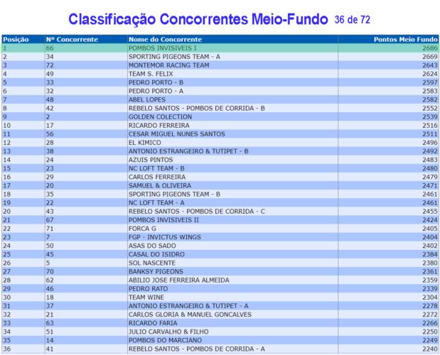 Mais uma bela marcação da Equipa I no Pombal Comunitário de Arazede. Vencedor da prova Algoz III por equipas, de 5 enviados, 3 nos 10%, (7º- Kannibaal x Olympiade 003, 23º- Puro Van Loon primo da 200, 26º- A '500' Van Loon neta da 200). Resultados que permitiram retomar a liderança da classificação Geral e assumir a liderança de Meio-Fundo. 72 equipas participantes, muitas delas de topo da columbofilia Nacional e até mundial.