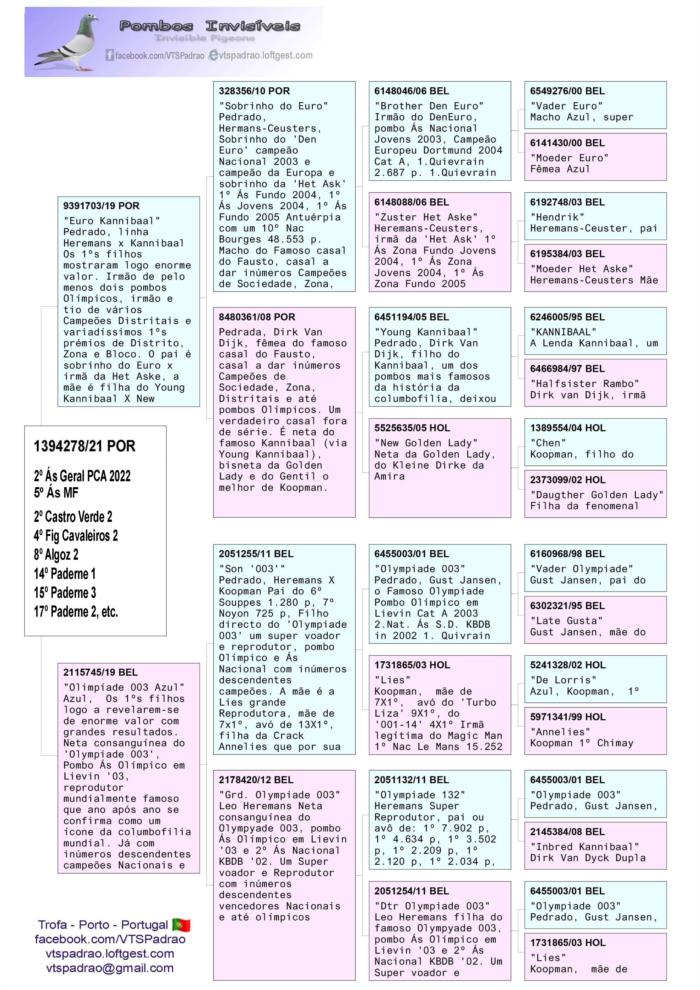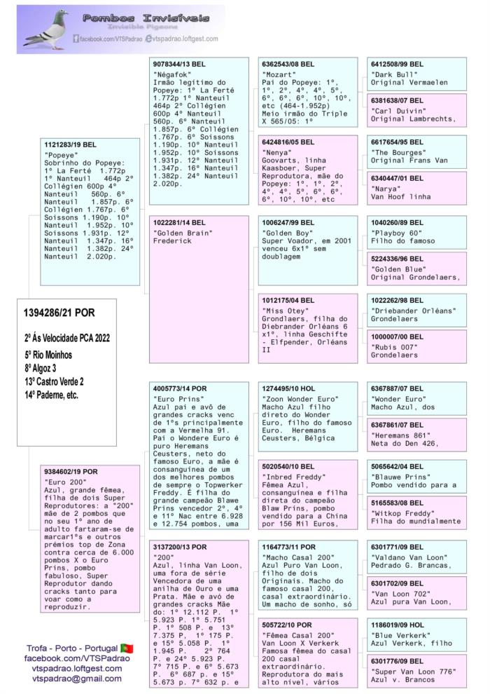 Para quem procura do Bom e do Melhor, 2º Ás Velocidade, 18º Ás Geral, prémios como 5º - 8º - 13º - 14º - 20, etc. onde concorrem grandes nomes da columbofilia Nacional e alguns até mundial, e não são meia dúzia de provas em épocas estranhas, são 12 provas do calendário Nacional juntamente com o Distrito de Coimbra. Neto da 200, todos os irmãos têm dado muito bons, irmão legítimo da Anilha de Prata MF Tirsense e vencedora de 1ºs prémios 2022, outro irmão legítimo noutra sociedade foi quase sempre o 1º do pombal, às vezes com 5m de avanço. Vários primos e tios vencedores ou Topo a nível Distrital! Isto também engana muito pouco!!!
