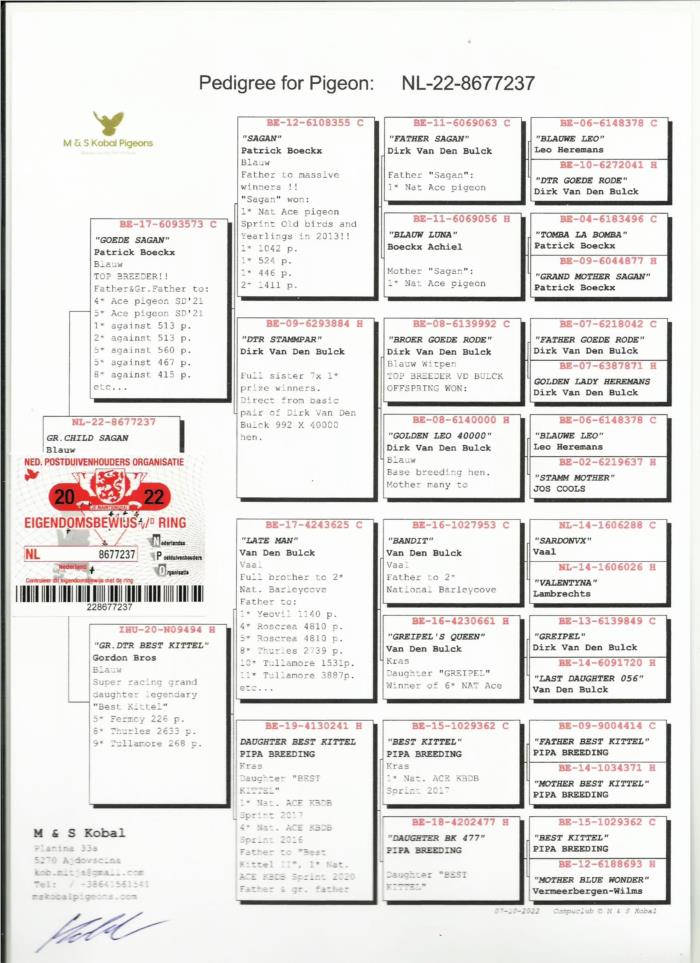 Mais uma apresentação, que bela fêmea Neta do 𝗦𝗮𝗴𝗮𝗻 e Bisneta do 𝗕𝗲𝘀𝘁 𝗞𝗶𝘁𝘁𝗲𝗹 O Pai desta fêmea é um Super Reprodutor de Patrick Boeckx, pai/Avô de: 4º Pombo Ás Veloc. '21. 5º Pombo Ás Veloc. '21. 1º – 513 p. 2º – 513 p. 5º – 560 p. 5º – 467 p. 8º – 415 p. Ele é filho do 𝗦𝗮𝗴𝗮𝗻, 1º Ás Nac. Veloc. Adultos e Yearlings 2013! E venceu: 1º Noyon 1.042 p. 1º Noyon 524 p. 1º Noyon 446 p. 2º Noyon 1.411 p. 2º Noyon 624 p. 6º Noyon 667 p. A mãe desta fêmea é neta do 𝗕𝗲𝘀𝘁 𝗞𝗶𝘁𝘁𝗲𝗹 1º Ás Nacional Sprint KBDB 2017 com coeficiente recorde. Esta fêmea é ainda neta de uma irmã da mãe da Olympic Rosita, a mãe do Kittel e do Greipel. O Greipel consta também no seu pedigree. Excelente Fêmea em mãos, pedigree e grandes resultados de parentes próximos como meio-irmãos, veio para cruzar com Van den Bulck (Kittel ou Blauwe Leo), Best Kittel ou Leo Heremans, já cá existentes, provavelmente irá fazer casal com um neto do Best Kittel.