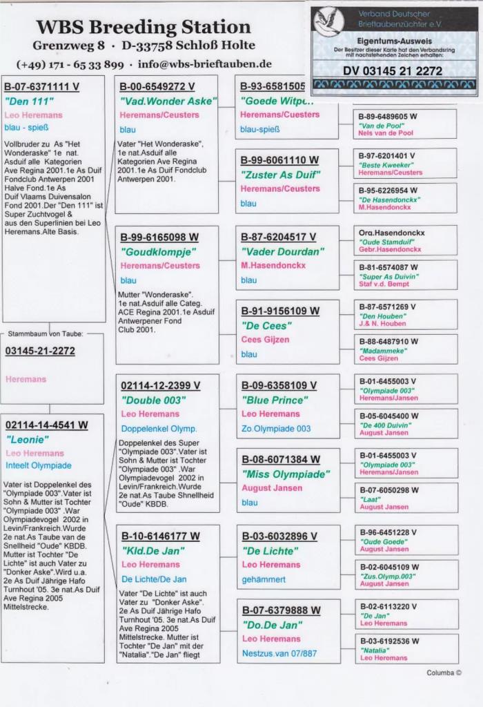 Último reforço de inverno da linha Leo Heremans, mais uma peça decolecção - um sobrinho da 𝐖𝐨𝐧𝐝𝐞𝐫𝐚𝐬𝐤𝐞. O Pai é um Super Reprodutor irmão legítimo da 𝐖𝐨𝐧𝐝𝐞𝐫𝐚𝐬𝐤𝐞 que foi: 1º Ás Nac. geral Ave Regina '01, 1º Ás Fundo Club Antwerp '01, 1º Ás Vlaams MF Duivensalon '01, venceu: 1º Bourges 1.347 p, 2º Dourdan 1.866 p, 2º Bourges 5.719 p, 3º Orleans 1.422 p, etc A mãe é da linha do Olympiade 003 e do Jan, é neta do 𝐃𝐞 𝐋𝐢𝐜𝐡𝐭 que é pai do Donker Aske (1º Ás MF com 2º 1.476 p. 2º 1.317 p., 3º 1.056 p, 3º 568 p.) e 𝐩𝐚𝐢 𝐝𝐚 𝐄𝐞𝐧𝐨𝐨𝐠𝐬𝐤𝐞 (a fêmea do último casal de Ouro Leo Heremans, super Reprodutora). Mais um excelente macho, de excelente linhagem com resultados de parentes muito próximos como meios-irmãos, para juntar à nossa colecção Heremans.