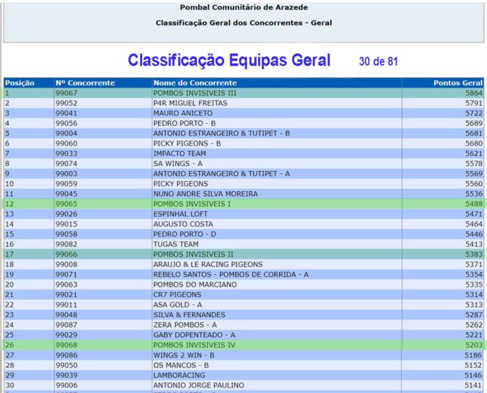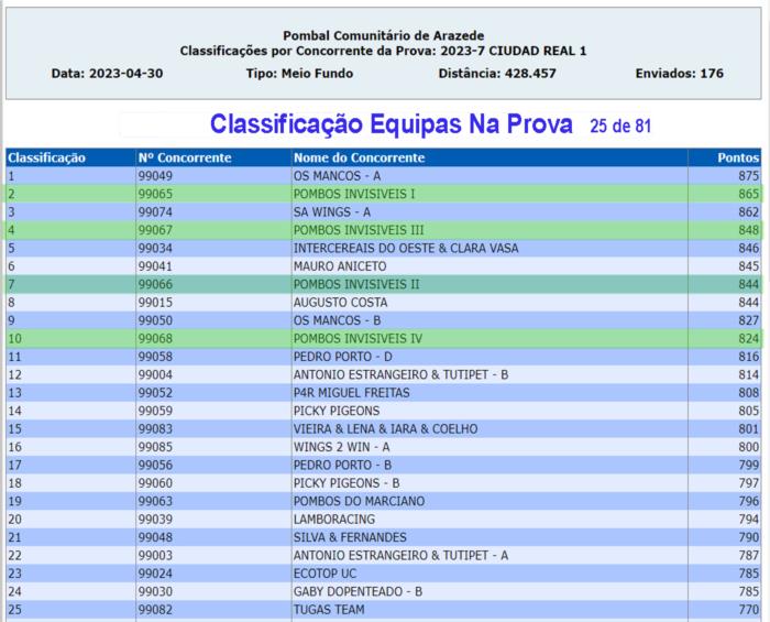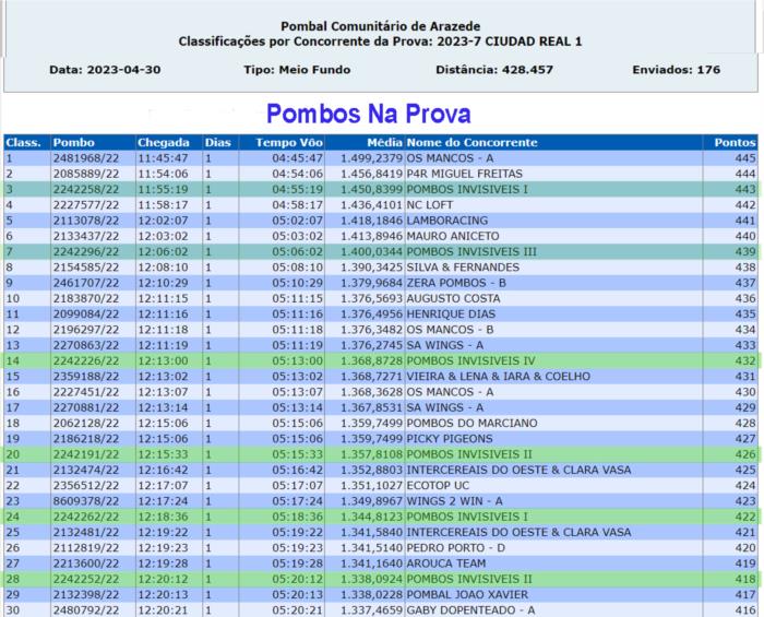 Mais uma excelente prestação dos nossos atletas no PC Arazede, prova de MF 429 Km, resultados: 𝟑º, 𝟕º, 𝟏𝟒º, 𝟐𝟎º, 𝟐𝟒º, 𝟐𝟖º, 𝟑𝟕º, 𝟓𝟒º, 𝟕𝟎º, 𝟖𝟏º 𝐞 𝟏𝟎𝟏º. São 𝟔 𝐩𝐨𝐦𝐛𝐨𝐬 𝐧𝐨𝐬 𝐩𝐫𝐢𝐦𝐞𝐢𝐫𝐨𝐬 𝟐𝟖, quase 25% dos pombos dos 28. A nível de equipas as nossas 𝟒 𝐞𝐪𝐮𝐢𝐩𝐚𝐬 𝐞𝐬𝐭𝐚𝐨 𝐧𝐚𝐬 𝟏𝟎 𝐦𝐞𝐥𝐡𝐨𝐫𝐞𝐬 𝐞𝐪𝐮𝐢𝐩𝐚𝐬 𝐝𝐚 𝐩𝐫𝐨𝐯𝐚!! Contra cerca de 90 equipas inscritas, mesmo com 2 das nossas equipas reduzidas a 2 pombos e uma a 3, e são necessários os 2 primeiros de cada equipa a fazer a classificação. Na classificação de equipas 𝐮𝐦𝐚 𝐝𝐚𝐬 𝐞𝐪𝐮𝐢𝐩𝐚𝐬 𝐥𝐢𝐝𝐞𝐫𝐚 𝐚 𝐆𝐞𝐫𝐚𝐥, 2º de Velocidade e 3º MF. Na classificação dos melhores pombos temos 6 pombos nos primeiros 25 do pombo Ás. Destaques da prova para o 258 que tira 3º pela segunda vez e já tinha um 6º. O 296, a contar com treinos acima de 200 Km, já é a 6ª dezena incluindo um 1º. Para os mais curiosos ficam aqui aqui os pedigrees do 6 primeiros. Essencialmente são Rauw-Sablon, Leo Heremans e Van Loon. ✌️