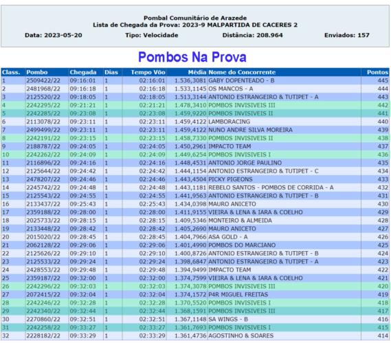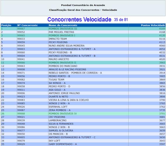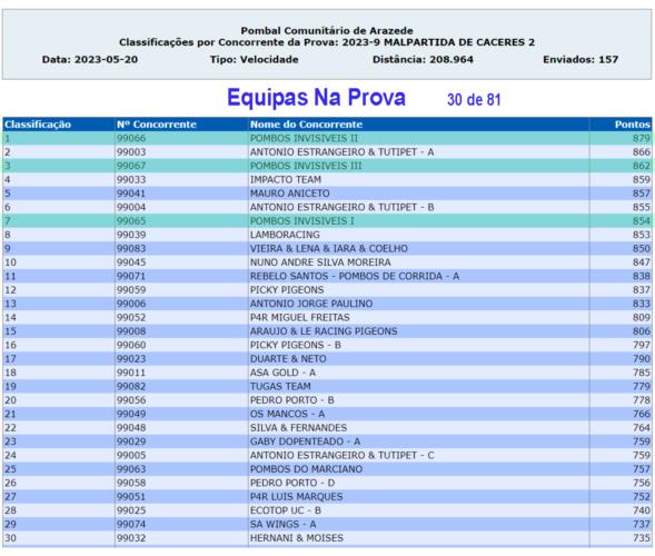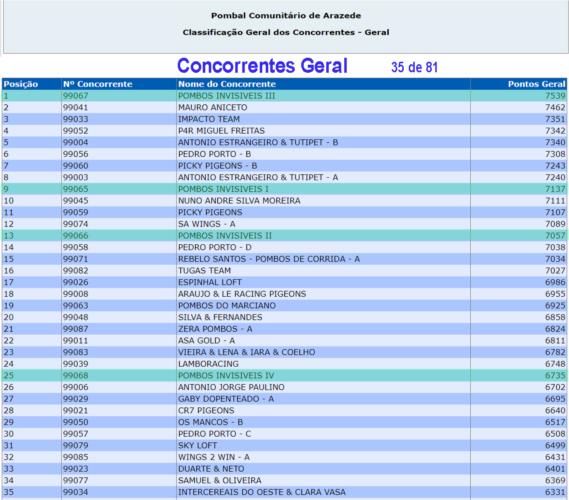 N 𝐮́𝐥𝐭𝐢𝐦𝐚 𝐩𝐫𝐨𝐯𝐚 𝐟𝐨𝐫𝐚𝐦 𝟒 𝐧𝐚 𝐃𝐞𝐳𝐞𝐧𝐚, quase metade! E foram 𝟖 𝐩𝐨𝐦𝐛𝐨𝐬 𝐧𝐨𝐬 𝐩𝐫𝐢𝐦𝐞𝐢𝐫𝐨𝐬 𝟑𝟏! O que quer dizer que 𝐦𝐚𝐢𝐬 𝐝𝐞 𝟐𝟓% 𝐝𝐨𝐬 𝐩𝐨𝐦𝐛𝐨𝐬 𝐝𝐨𝐬 𝐩𝐫𝐢𝐦𝐞𝐢𝐫𝐨𝐬 𝟑𝟏 𝐬𝐚̃𝐨 𝐝𝐚𝐬 𝐧𝐨𝐬𝐬𝐚𝐬 𝐞𝐪𝐮𝐢𝐩𝐚𝐬! Em rezumo: 𝟒º, 𝟓º, 𝟖º, 𝟏𝟎º, 𝟐𝟔º, 𝟐𝟖º, 𝟐𝟗º, 𝟑𝟏º, 𝟑𝟗º, 𝟒𝟏º, etc. São 𝟏𝟎 𝐩𝐨𝐦𝐛𝐨𝐬 (de 12) 𝐧𝐨𝐬 𝐩𝐫𝐢𝐦𝐞𝐢𝐫𝐨𝐬 𝟒𝟏, o que quer dizer que 𝐦𝐚𝐢𝐬 𝐝𝐞 𝟖𝟑% 𝐝𝐨𝐬 𝐧𝐨𝐬𝐬𝐨𝐬 𝐩𝐨𝐦𝐛𝐨𝐬 𝐞𝐦 𝐩𝐫𝐨𝐯𝐚 𝐜𝐡𝐞𝐠𝐚𝐫𝐚𝐦 𝐧𝐨𝐬 𝐩𝐫𝐢𝐦𝐞𝐢𝐫𝐨𝐬 𝟐𝟔% 𝐝𝐨𝐬 𝐞𝐧𝐜𝐞𝐬𝐭𝐚𝐝𝐨𝐬. É Obra! Com isto e a nível de 𝐞𝐪𝐮𝐢𝐩𝐚𝐬 𝐧𝐚 𝐩𝐫𝐨𝐯𝐚 as nossas foram a 𝟏ª, 𝟑ª 𝐞 𝟕ª 𝐦𝐞𝐥𝐡𝐨𝐫𝐞𝐬 da Prova. Na 𝐂𝐥𝐚𝐬𝐬𝐢𝐟𝐢𝐜𝐚𝐜̧𝐚̃𝐨 𝐆𝐞𝐫𝐚𝐥 𝐦𝐚𝐧𝐭𝐞𝐦𝐨𝐬 𝐚 𝐥𝐢𝐝𝐞𝐫𝐚𝐧𝐜̧𝐚 𝐧𝐚 𝐆𝐞𝐫𝐚𝐥 e em 𝐕𝐞𝐥𝐨𝐜𝐢𝐝𝐚𝐝𝐞 𝐭𝐞𝐦𝐨𝐬 𝐚 𝟏ª 𝐞 𝟑ª 𝐦𝐞𝐥𝐡𝐨𝐫𝐞𝐬 𝐞𝐪𝐮𝐢𝐩𝐚𝐬. A nível de individualidades destaque para o 295 que depois de ter feito 3º na prova anterior, faz 4º nesta e assume a liderança do pombo Ás. Ele juntamente com a irmã/o de ninho 296, contando com os treinos longos, já contam 9 dezenas este ano!