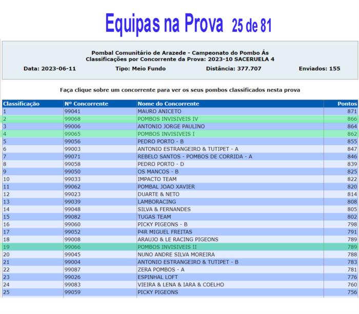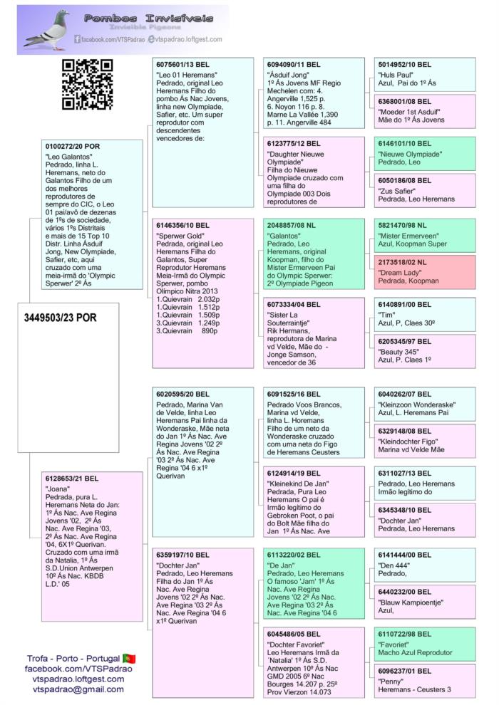 Também em Arazede mais uma excelente prestação dos nossos atletas na prova 10, com um brilhante 𝟏º 𝐥𝐮𝐠𝐚𝐫, mas também a destacar 𝟔 𝐩𝐨𝐦𝐛𝐨𝐬 (𝐝𝐞 𝟏𝟐) 𝐚𝐭𝐞́ 𝐚𝐨 𝟐𝟏º, o que dá mais de 28% dos pombos serem nossos nos primeiros 21. Foram 1º, 11º, 12º, 14º, 19º, 21º, etc. A nível de equipas tivemos a 2ª e 4ª melhores da Prova. Isto contra pombos de columbófilos de topo Nacional e alguns internacional. O primeiro prémio (faz 2º na sociedade contra pombos adultos, no total de 553) é um/a 𝐟𝐢𝐥𝐡𝐨/𝐚 𝐝𝐨 𝟓𝟖𝟖, Super Crack Voador que 𝐯𝐞𝐧𝐜𝐞𝐮 𝐯𝐚́𝐫𝐢𝐚𝐬 𝐯𝐞𝐳𝐞𝐬 𝟏º 𝐜𝐨𝐧𝐭𝐫𝐚 𝐦𝐚𝐢𝐬 𝐝𝐞 𝟔 𝐦𝐢𝐥 𝐩𝐨𝐦𝐛𝐨𝐬, pai do 500 que venceu um 1º em Arazede 2021, avô duma fêmea que até meio da campanha já levava 5 X 1º, para além de ter irmãos, tios, primos, sobrinhos, etc, a vencedores a nível Distrital! Aqui cruzado com a Joana, uma neta do Jan Leo Heremans (pedigree em baixo). Vários irmãos deste 1º prémio foram leiloados no ano passado ao preço da chuva!