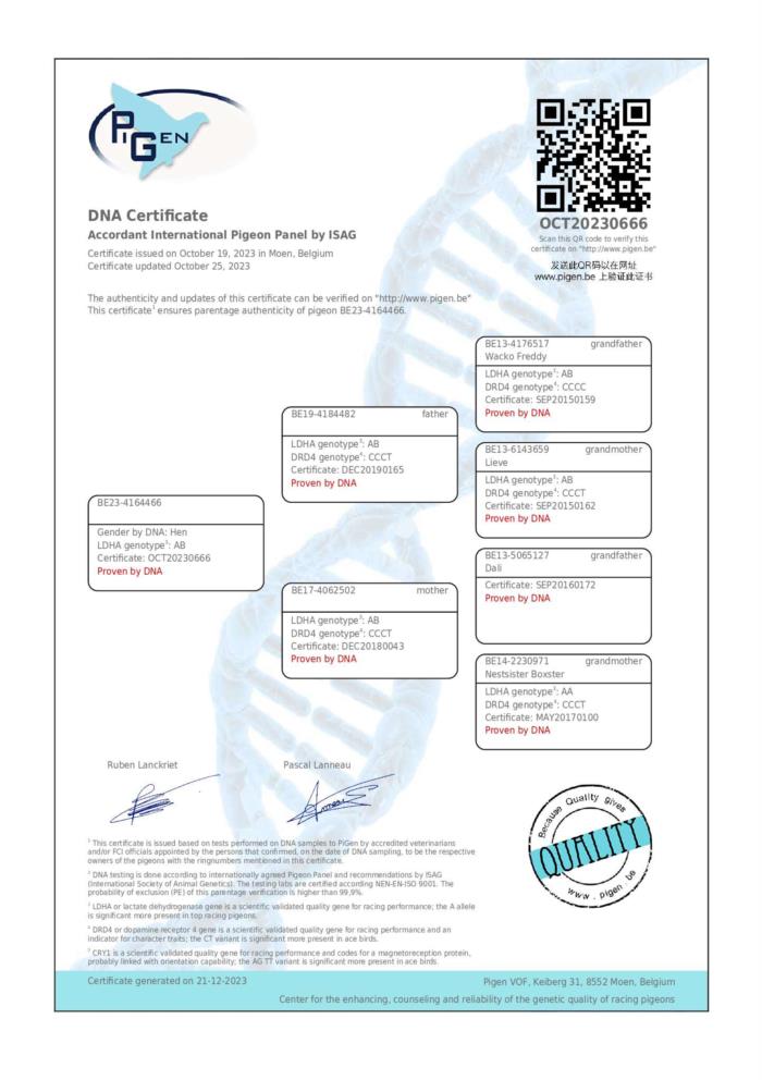 A sua irmã 𝐁𝐨𝐱𝐬𝐭𝐞𝐫 já aqui apresentada também venceu 2X1º Prov. Super linhagem PIPA com resultados de topo Nacional na Bélgica por todos os lados de parentesco. Acompanhada naturalmente do certificado de ADN LDHA AB DRD4 CCCC