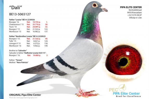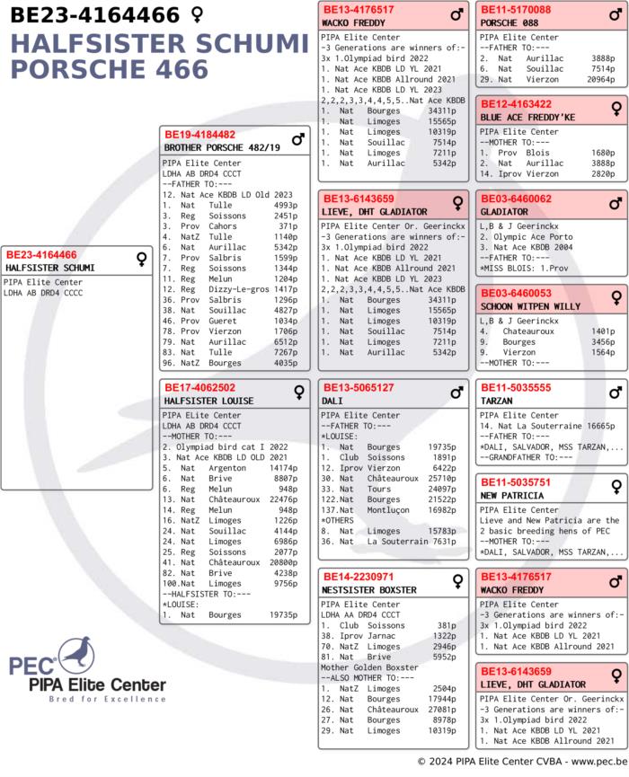 Outros meios-irmãos desta fêmea venceram: 5º Nac. Argenton III - 14,174 p. / 1º 1,187 p. 13º Nac. Chateauroux II - 22,476 p. / 1º 914 p. 12º Nac. Ace KBDB old long dist. 2º Reg. Sezanne - 877 p. 3º Reg. Soissons - 2,451 p. 3º prov. Cahors - 381 p. 4º Nac. Zone Tulle I - 1,140 p. 6º Nac. Aurillac - 5,342 p. 7º prov. Salbris - 1,599 p. 7º Reg. Soissons - 1,344 p. 38º Nac. Souillac - 4,827 p. 79º Nac. Aurillac - 6,512 p. 83º Nac. Tulle - 7,267 p.