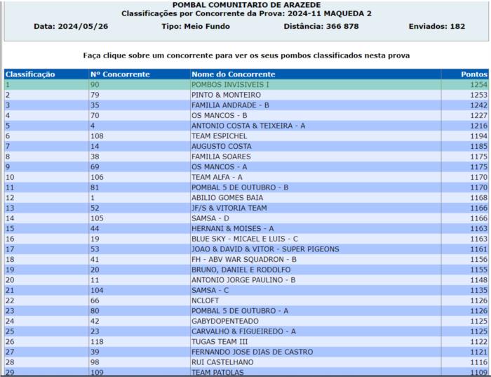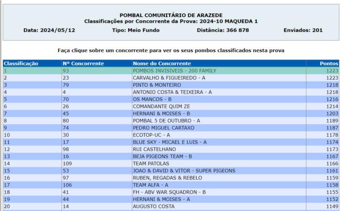As duas últimas provas de MF no pombal comunitário de Arazede foram ganhas pelas nossas equipas, meio de Maio realizou-se a prova de MAQUEDA 1, 367 Km, a nossa equipa POMBOS INVISÍVEIS 200 FAMILY VENCE A PROVA (em igualdade pontual), com 2 sobrinhos da 200 a fazerem 9º e 40º os únicos ainda em prova dessa equipa.